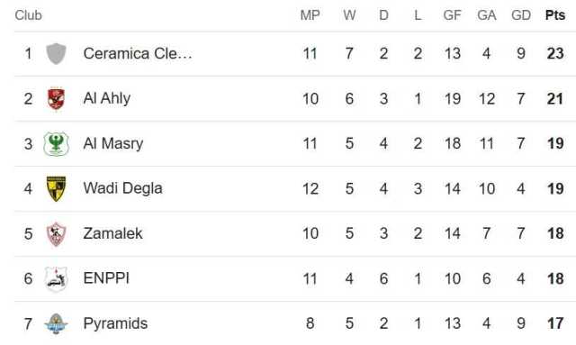 إليكم الجدول:وكان قد أكد وليد صلاح عبداللطيف نجم نادي الزمالك السابق أن البلجيكي يانيك فيريرا المدير الفني للفريق الأول لكرة القدم لا يصلح نهائياً لقيادة الأبيض في المرحلة المقبلة، وكان لابد من رحيله منذ فترة طويلة.