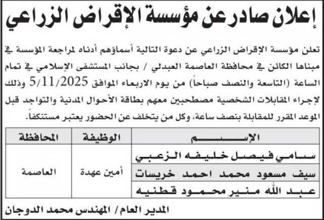هذا ودعت مؤسسة الاقراض الزراعي عددا من المرشحين لاجراء #المقابلة_الشخصية.