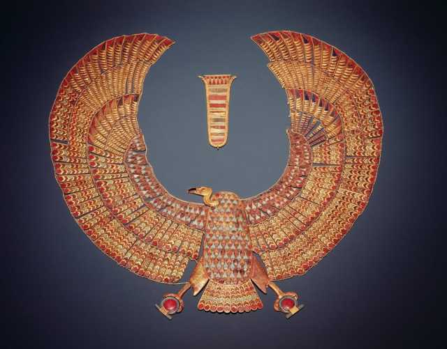 ونستعرض أبرز ماوجد في مقبرة الملك توت عنخ آمون من قلادات على شكل طوق للإله النسر نخبت وجدت في المقبرة "1370-1352" قبل الميلاد ، وهي عبارة عن ذهب مرصع بأحجار شبه كريمة.