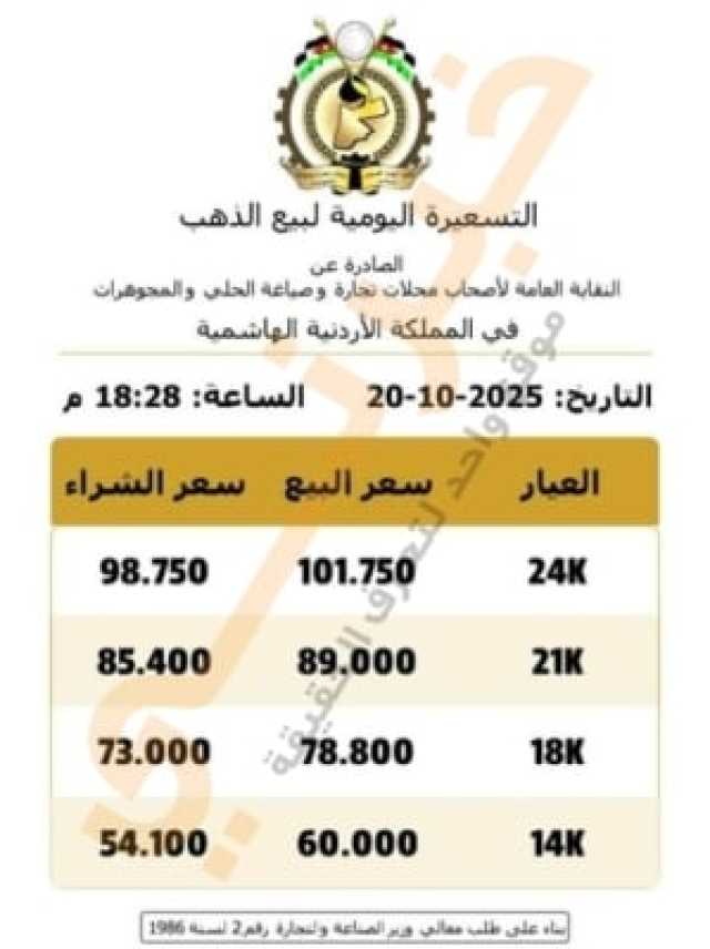 ففي يوم 20/10 الجاري، بلغ سعر غرام الذهب عيار 21 — الذي يُعدّ الأكثر طلبًا بين الأردنيين — 89 دينارًا للغرام الواحد، فيما انخفض سعره اليوم إلى 79.7 دينار للغرام الواحد، بانخفاض قدره 9.3 دنانير.
