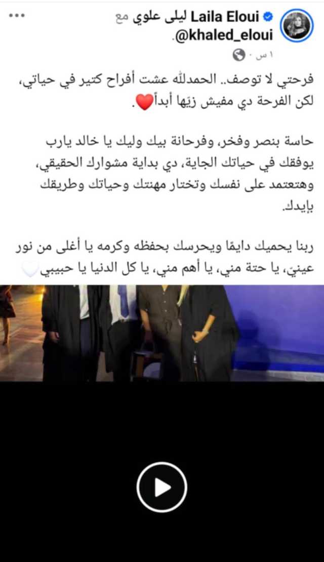 وتابعت:"حاسة بنصر وفخر، وفرحانة بيك وليك يا خالد، يارب يوفقك في حياتك الجاية، دي بداية مشوارك الحقيقي، وهتعتمد على نفسك وتختار مهنتك وحياتك وطريقك بإيدك، ربنا يحميك دايمًا ويحرسك بحفظه وكرمه يا أغلى من نور عينيّ، يا حتة مني، يا أهم مني، يا كل الدنيا يا حبيبي????".