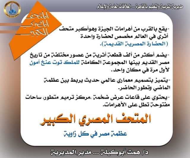 نشرت الصفحة الرسمية لمديرية التربية والتعليم بالقاهرة عبر فيس بوك ، شرحا مبسطا لتعريف الطلاب بتفاصيل المتحف المصري الكبير.