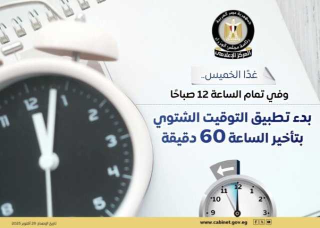 وأعلن مجلس الوزراء، أن غدًا الخميس سيتم تطبيق التوقيت الشتوي 2025، وفقًا للقانون رقم 24 لسنة 2023، حيث يتم تأخير الساعة 60 دقيقة، في نهاية يوم الخميس الأخير من شهر أكتوبر، والذي يوافق هذا العام 30 أكتوبر 2025، ليبدأ تطبيق التوقيت الجديد اعتبارًا من صباح الجمعة 31 أكتوبر 2025.