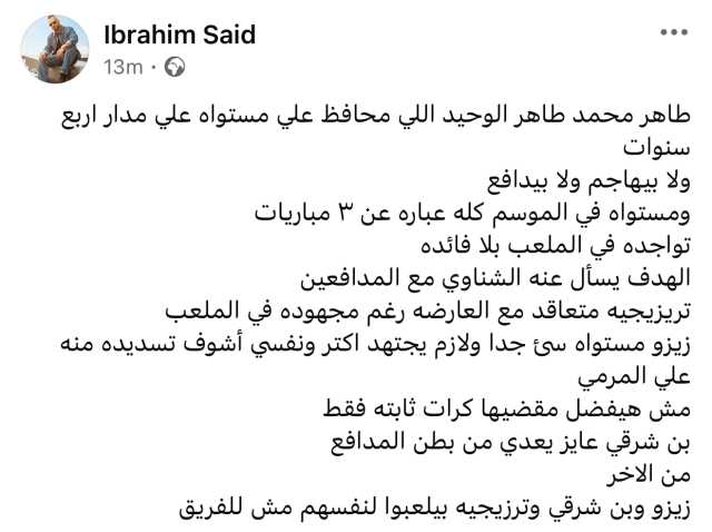 وكتب إبراهيم سعيد في منشور عبر حسابه الشخصي بموقع فيسبوك: “طاهر محمد طاهر الوحيد اللي محافظ على مستواه على مدار أربع سنوات، ولا بيهاجم ولا بيدافع، ومستواه في الموسم كله عبارة عن ٣ مباريات، تواجده في الملعب بلا فائدة، الهدف يسأل عنه الشناوي مع المدافعين".