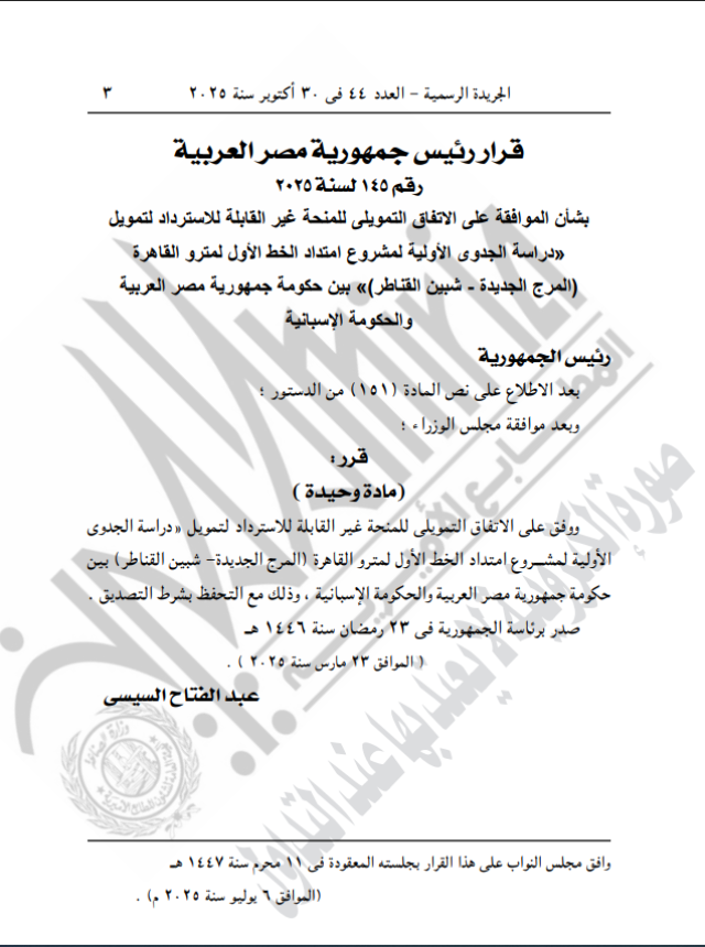 أصدر السيد الرئيس عبدالفتاح السيسي، قرار رئيس جمهورية مصر العربية رقم 145 لسنة 2025؛ بشأن الموافقة على الاتفاق التمويلي للمنحة غير القابلة للاسترداد لتمويل دراسة الجدوى الأولية لمشروع امتداد الخط الأول لمترو القاهرة المرج الجديدة - شبين القناطر بين حكومة جمهورية مصر العربية والحكومة الإسبانية.