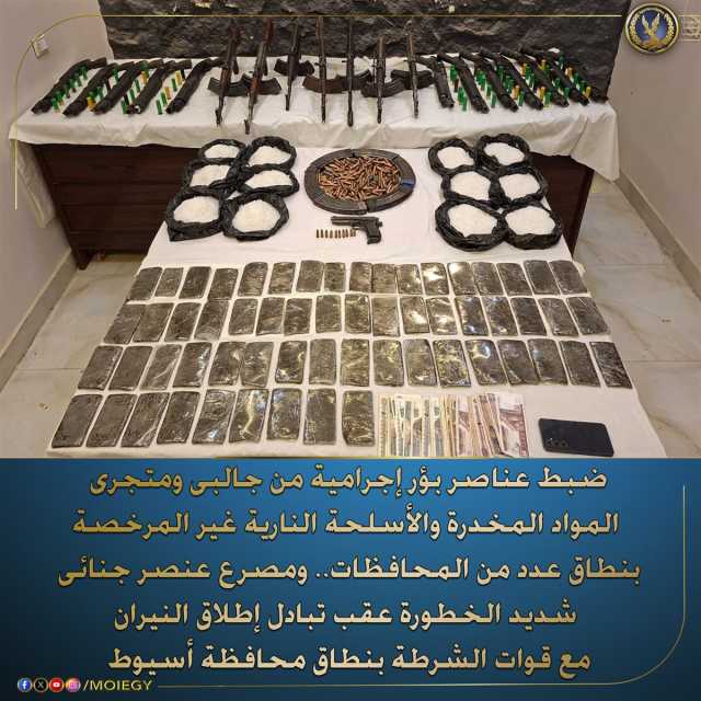 وفي واقعة أخرى ألقت الأجهزة الأمنية بوزارة الداخلية القبض على عناصر بؤر إجرامية من جالبي ومتجري المواد المخدرة والأسلحة النارية غير المرخصة بنطاق عدد من المحافظات، ومصرع عنصر جنائي شديد الخطورة عقب تبادل إطلاق النيران مع قوات الشرطة بنطاق محافظة أسيوط.