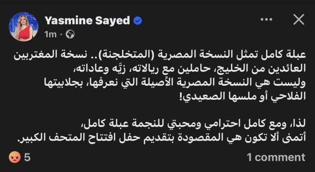وأضافت: “وليست هي النسخة المصرية الأصيلة التي نعرفها، بجلابيتها الفلاحي أو ملسها الصعيدي! لذا، ومع كامل احترامي ومحبتي للنجمة عبلة كامل”.