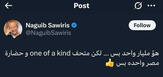 كشف رجل الأعمال المصري نجيب ساويرس، خلال منشور نشره عبر حسابه الرسمي على موقع "إكس"، أن تكلفة إنشاء المتحف المصري الكبير بلغت نحو مليار دولار فقط، مؤكدًا أن ما تحقق في هذا المشروع يعد إنجازًا ضخمًا وفريدًا يليق بعظمة مصر وتاريخها الممتد عبر آلاف السنين.