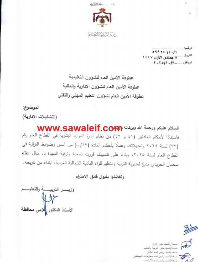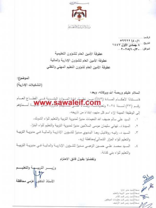 كلمات دلالية: سواليف وزير التربية تشكيلات إدارية كبار الموظفين