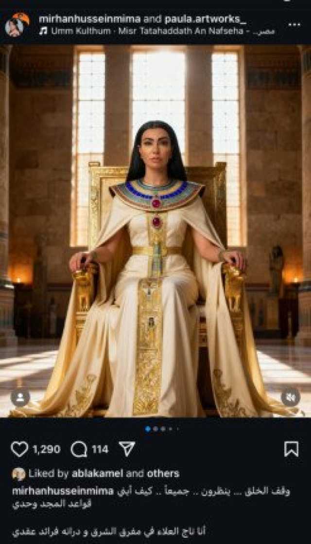 ونشر ميريهان حسين، عبر حسابها بموقع «إنستجرام» صورة لها بملابس فرعونية تم إعدادها من قبل الذكاء الاصطناعي، وعلقت عليها: «وقف الخلق ينظرون جميعاً كيف أبني قواعد المجد وحدي.