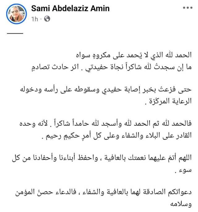 وكتب سامي عبد العزيز عبر حسابه الشخصي بالموقع الأشهر فيس بوك: "الحمد لله الذي لا يُحمد على مكروه سواه، ما إن سجدتُ لله شاكراً نجاة حفيدتي إثر حادث تصادم، حتى فزعتُ بخبر إصابة حفيدي وسقوطه على رأسه ودخوله الرعاية المركّزة".