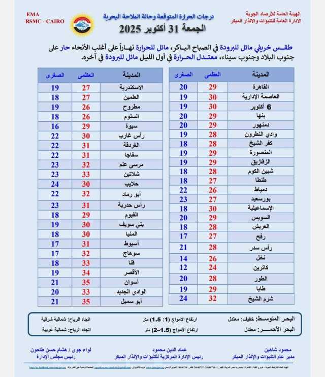 الطقس ودرجات الحرارة.. يشهد اليوم الجمعة الموافق 31 أكتوبر، طقس خريفى على أغلب المناطق، لتكون الأجواء مائلة للبرودة في الصباح الباكر ومائلة للحرارة نهاراً على أغلب الأنحاء حارة على جنوب سيناء وجنوب البلاد.
