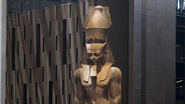 وُضع تمثال الملك رمسيس الثاني الضخم الذي يزن 83 طنا ويبلغ ارتفاعه 11 مترا، عند مدخل ردهة المتحف الفسيحة.
