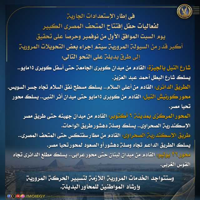 أعلنت وزارة الداخلية انه فى إطار الاستعدادات الجارية لفعاليات حفل افتتاح المتحف المصرى الكبير يوم السبت الموافق الأول من نوفمبر، وحرصاً على تحقيق أكبر قدر من السيولة المرورية سيتم إجراء بعض التحويلات المرورية إلى طرق بديلة.