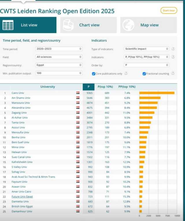 وأوضح رئيس الجامعة أن هذا الإنجاز يأتي ثمرة الجهود المستمرة التي تبذلها الجامعة لتطوير منظومة البحث العلمي ودعم النشر الدولي، حيث ظهرت الجامعة في النسخة المفتوحة من التصنيف (CWTS Leiden Ranking Open Edition 2025) ضمن قائمة الجامعات المصرية المتميزة.