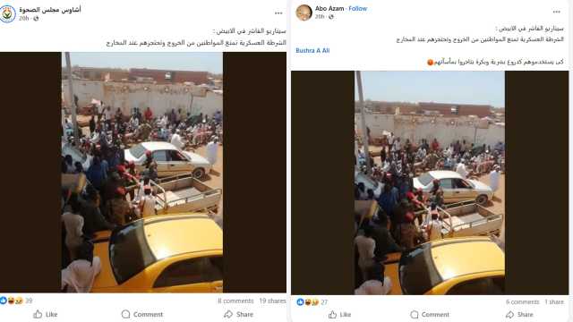 حصدت الصورة آلاف المشاركات والتفاعلات، مصحوبة برواية مُضللة تقول: "سيناريو الفاشر في الأبيض الشرطة العسكرية تمنع المواطنين من الخروج وتحتجزهم عند المخارج".