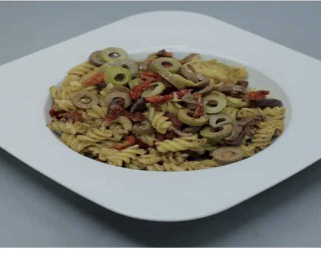 يضاف ملح, فلفل, أعشاب إيطالية, طماطم مجففة, حلقات زيتون أخضر وأسود مع استمرار تشويح المكونات.تضاف المكرونة.تقلب المكونات جيدا.توضع في طبق التقديم ثم تقدم.