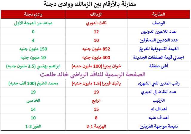 وكتب خالد طلعت عبر صفحته على موقع التواصل الاجتماعي فيسبوك :"مقارنة بالأرقام بين الزمالك ووادي دجلة !!!".