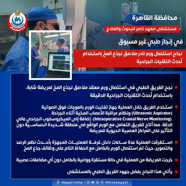 استغرقت العملية عدة ساعات داخل غرفة العمليات المجهزة بأحدث نظم الرصد والتصوير، حيث تم استئصال الورم بالكامل مع الحفاظ التام على وظائف جذع المخ.