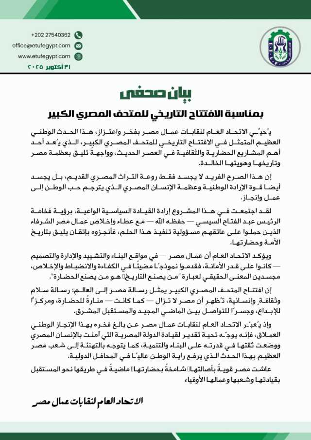 وشدد اتحاد العمال على أن افتتاح المتحف المصري الكبير يمثل رسالة مصر إلى العالم؛ رسالة سلامٍ وثقافةٍ وإنسانية، تُظهر أن مصر لا تزال — كما كانت — منارةً للحضارة، ومركزًا للإبداع، وجسرًا للتواصل بين الماضي المجيد والمستقبل المشرق.