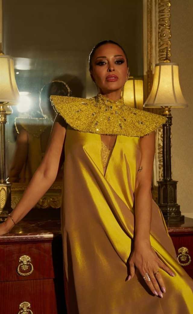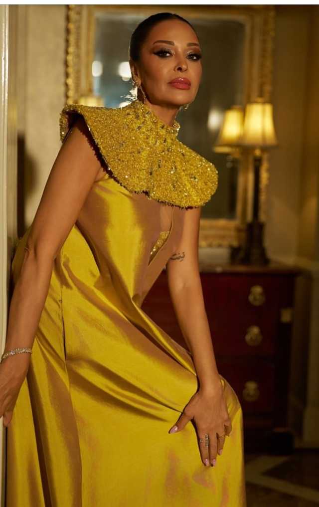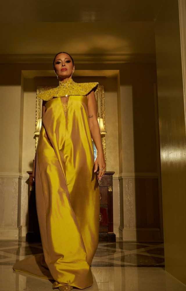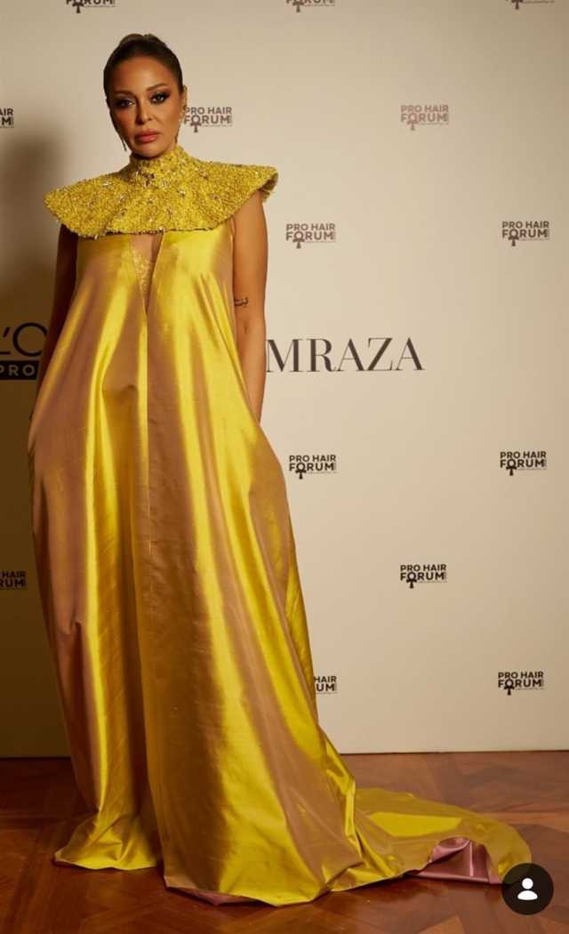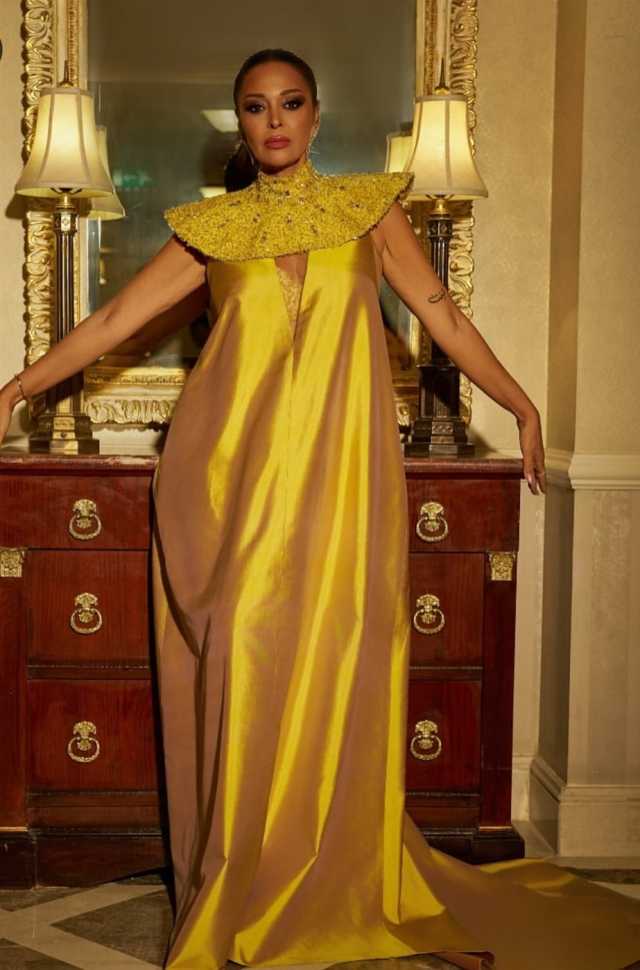 وبدت داليا البحيري بإطلالة ساحرة مزجت بين الأناقة والسحر في آن واحد، مرتديه فستان طويل فضفاض يشبه الكاب في تصميمه، صمم من قماش فاخر باللون الذهبي، حمل توقيع مصممة الأزياء المصرية العالمية فريدة تمرازا.
