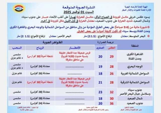 كشفتِ الهيئة العامة للأرصاد الجوية عن حالة الطقس اليوم السبت 1 نوفمبر 2025، موضحة الظواهر الجوية ودرجات الحرارة المتوقعة في محافظات ومدن مصر.
