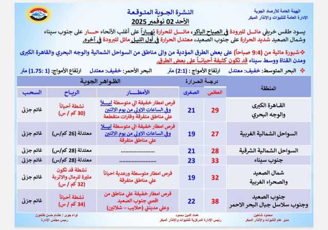 الظواهر الجويةوعن الظواهر الجوية تتكون شبورة مائية صباحا على شمال البلاد حتى القاهرة الكبرى وشمال الصعيد ووسط سيناء ومدن القناة قد تكون كثيفة أحيانا على بعض الطرق، وفرص لسقوط أمطار متوسطة ورعدية أحيانا على مناطق من شمال الصعيد والصحراء الغربية، وفرص لسقوط أمطار خفيفة إلى متوسطة ليلا على مناطق من السواحل الشمالية الغربية والوجه البحري تمتد إلى مناطق متفرقه من القاهرة الكبرى على فترات متقطعة، وأمطار خفيفة على مناطق من أقصى جنوب الصعيد وعلى مدينتي حلايب وشلاتين على فترات متقطعة، وتنشط رياح على مناطق من القاهرة الكبرى وجنوب البلاد على فترات متقطعة.