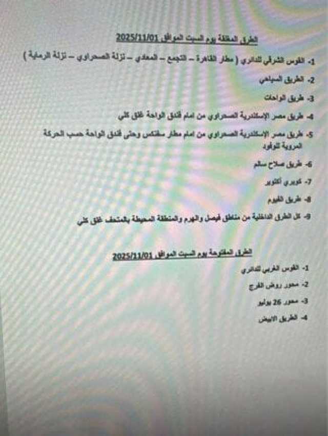 .. أعلنت الجهات المعنية عن إجراء عدد من التحويلات المرورية إلى طرق بديلة، وهذا ضمن الاستعدادات الجارية لفعاليات حفل افتتاح المتحف المصري الكبير اليوم السبت حرصًا على تحقيق أكبر قدر من السيولة المرورية