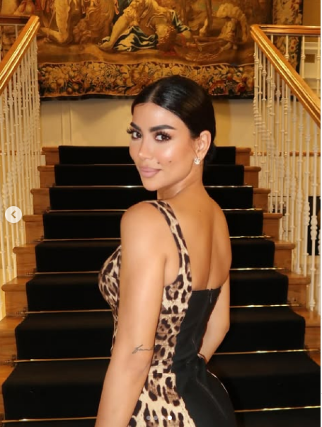 تألقت كارولين عزمي في الصور بإطلالة ملفتة، حيث ارتدت فستان قصير ذا أكمام مكشوفة واتسم التصميم بالقماش المصنوع من التايجر الذي يتصدر أحدث صيحات الموضة.