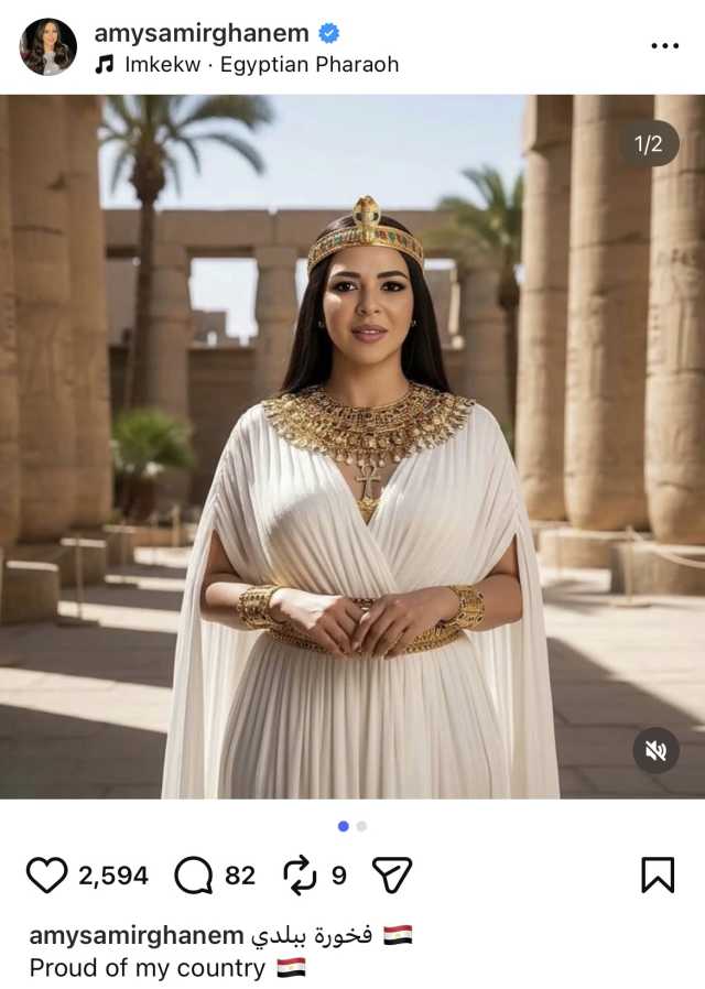 شاركت الفنانة إيمي سمير غانم، صورا بالزي الفرعوني على تريند الذكاء الاصطناعي عبر حسابها الشخصي على فيسبوك.