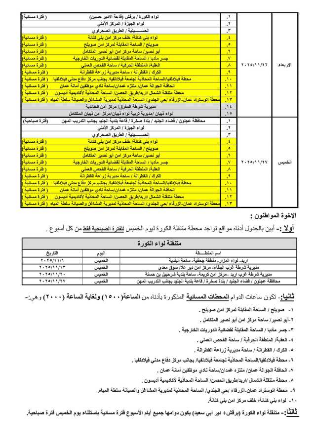 وسيكون الدوام الصباحي من الأحد حتى الأربعاء من الساعة 8:00 صباحًا حتى 2:00 ظهرًا، ويوم الخميس من 8:00 صباحًا حتى 1:00 ظهرًا، فيما سيكون دوام المحطات المسائية من الساعة 3:00 عصرًا حتى 8:00 مساءً.