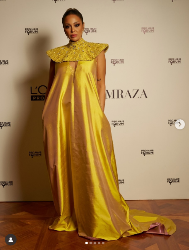 الفستان جاء بتصميم فخم ولافت المليء بالتطريزات الذهبية الأنيقة والمجوهرات الضخمة التي تحاكي الزخارف الفرعونية القديمة، فيما أضاف التاج المطرز بالأحجار الملوّنة لمسة ملكية تليق بالمناسبة التاريخية.