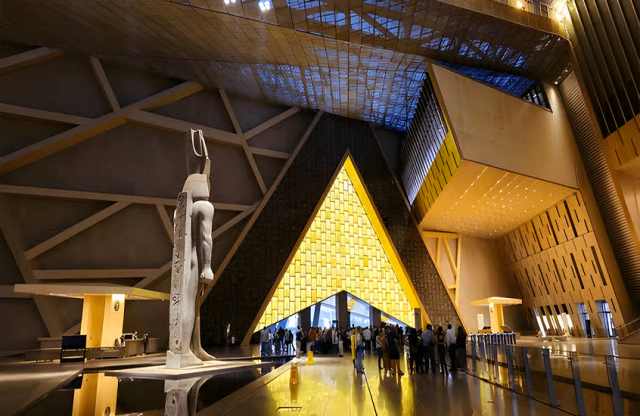 - يقف المتحف المصري الكبير جاهزًا ليستقبل زواره من كل أنحاء العالم، واجهة زجاجية ضخمة تطل على الأهرامات، وقاعات عرض مجهزة بأحدث تقنيات الإضاءة والحفظ والعرض المتحفي.