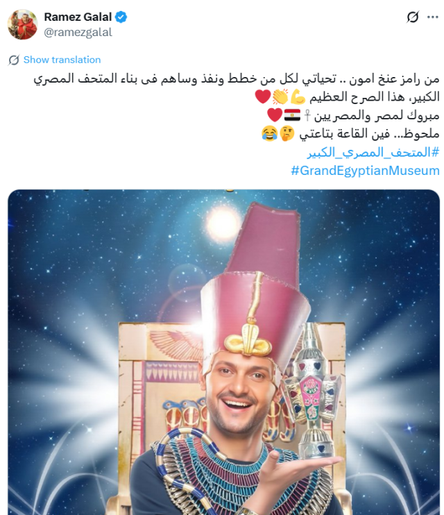 نشر رامز جلال صورته بالزي الفرعوني، وأرفقها بتعليق قائلًا: “من رامز عنخ آمون .. تحياتي لكل من خطط ونفذ وساهم فى بناء المتحف المصري الكبير، هذا الصرح العظيم … مبروك لمصر والمصريين”، مختتمًا بسؤال قائلًا: “ملحوظ... فين القاعة بتاعتي؟”.