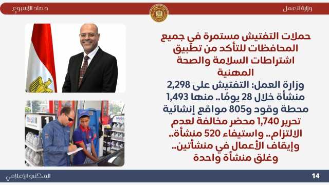 العمل في إسبوع تكثيف حملات متابعة تطبيق قانون العمل.. دعم عمالة المنشآت المتعثرة.. وفرص عمل بالداخل والخارج