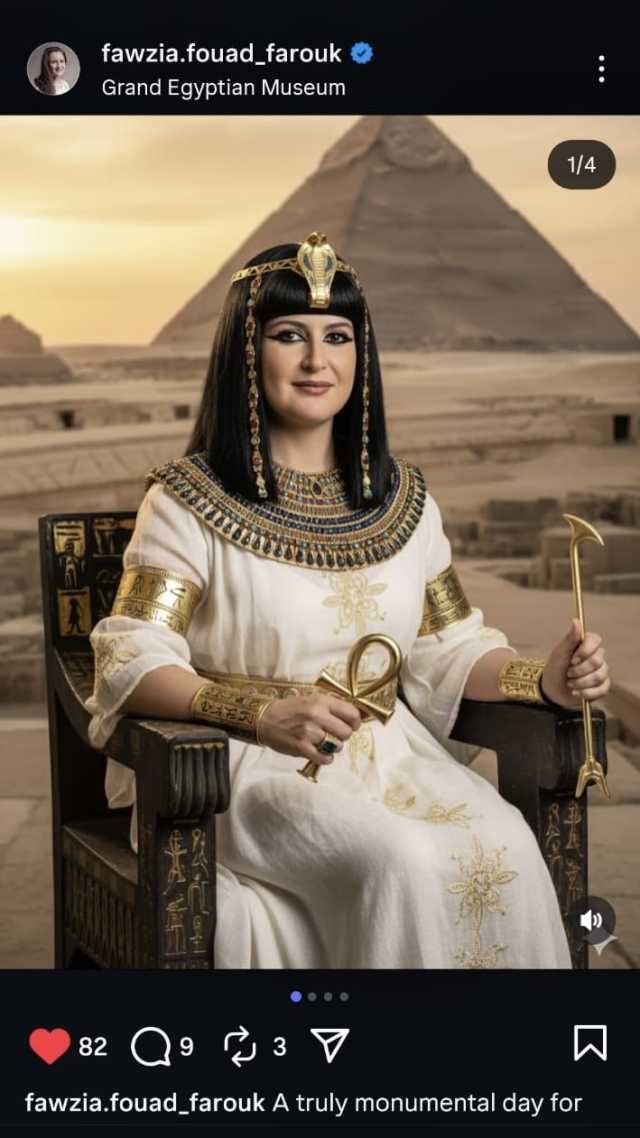 شاركت الأميرة فوزية حفيدة الملك فاروق، متابعيها بصور لها بالزي الفرعوني مستعينة بالذكاء الاصطناعي عبر حسابها الشخصي على إنستجرام، بالتزامن مع افتتاح المتحف المصري الكبير.