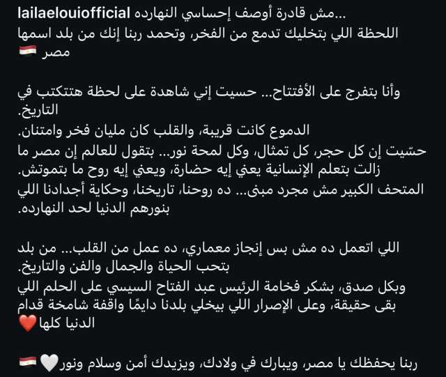 وتابعت ليلى علوي موجهة الشكر للرئيس عبد الفتاح السيسي قائلة: “اللي اتعمل ده مش بس إنجاز معماري، ده عمل من القلب… من بلد بتحب الحياة والجمال والفن والتاريخ.