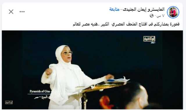 أعربت المايسترو إيمان جنيدي أول سيدة مايسترو في مصر والوطن العربي عن سعادتها بعد مشاركتها في إحدى فقرات حفل افتتاح المتحف المصري الكبير.