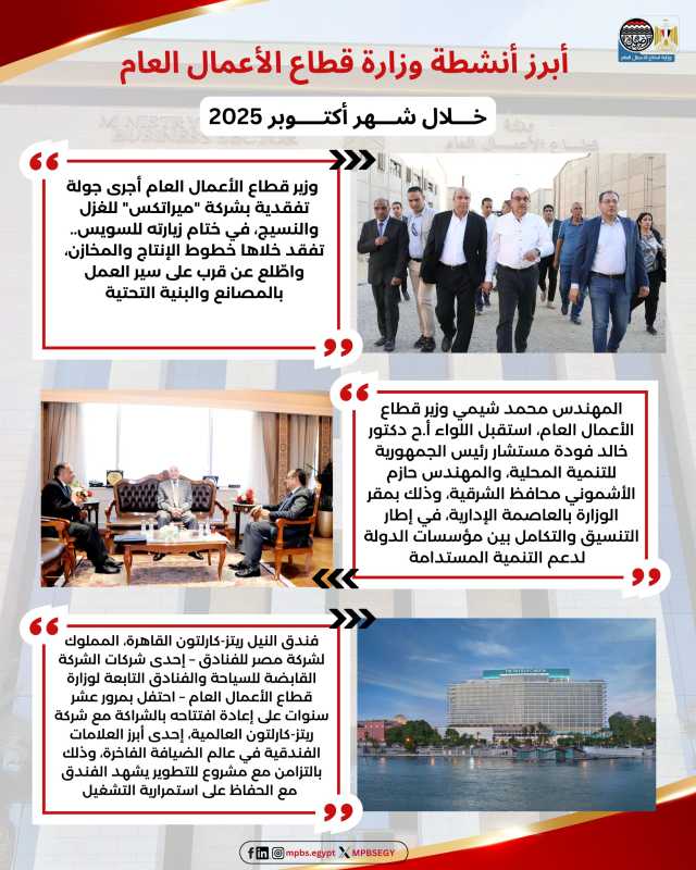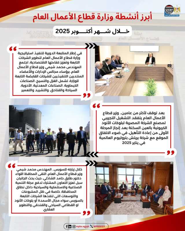واصلت وزارة قطاع الأعمال العام، في أكتوبر 2025، تنفيذ استراتيجيتها الشاملة لتطوير وتحسين أداء الشركات التابعة.