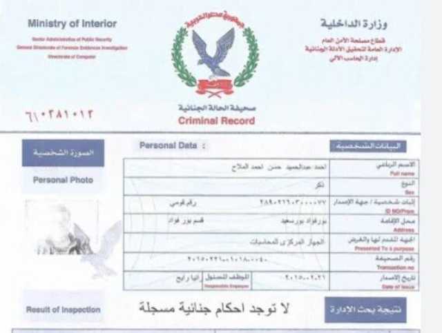 -تسليم الفيش الجنائي للمتقدم شخصيا بعد التحقق من هويته.