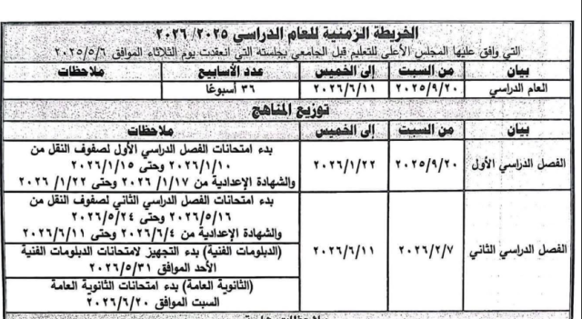 وقررت وزارة التربية والتعليم والتعليم الفني في الخريطة الزمنية للعام الدراسي الحالي 2025 / 2026 ، يخصص الأسبوع الأخير من كل فصل دراسي للمراجعة ، مؤكدة أن المواعيد السابق ذكرها تشمل هذه المواعيد جميع مراحل التعليم المختلفة في المدارس الرسمية والرسمية للغات والخاصة والخاصة للغات