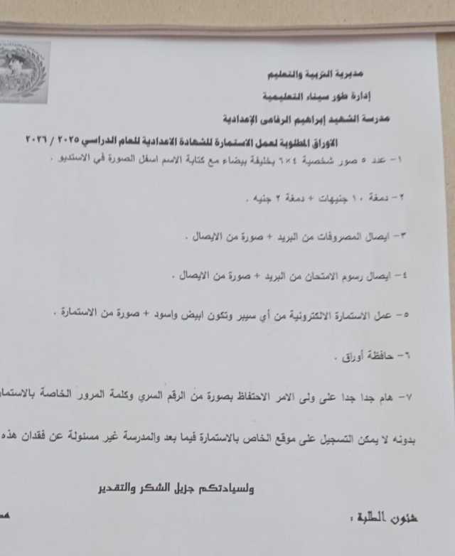 +٢صورة منه.طابع دعم مشروعات فئة ١٠جنيهات من البريد.دوسية بلاستيك.استمارة إلكترونية للطالبة ويتم التواصل مع المدرسة بشأنها.صورة من قرار الوصاية في حالة وفاة الأب.موعد امتحانات الشهادة الإعدادية 2026
