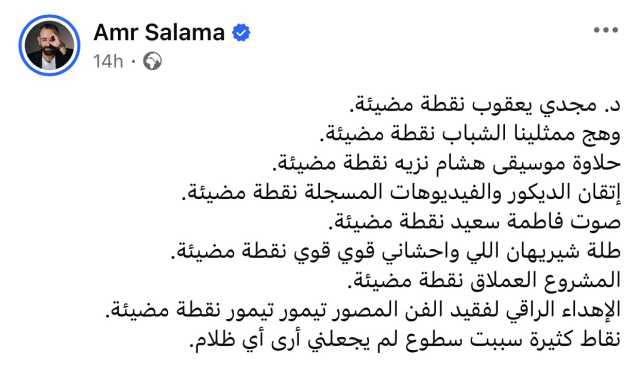 وكتب سلامة عبر حسابه الشخصي بموقع فيسبوك: " د. مجدي يعقوب نقطة مضيئة، وهج ممثلينا الشباب نقطة مضيئة، حلاوة موسيقى هشام نزيه نقطة مضيئة".