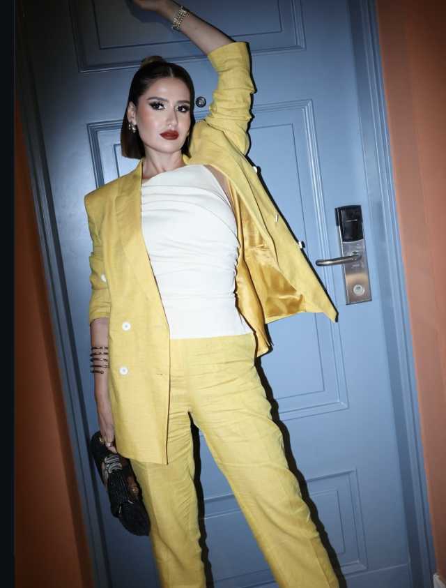 لفتت الفنانة هنا شيحة الأنظار بإطلالة أنيقة ومشرقة في أحدث ظهور لها، حيث اختارت بدلة باللون الأصفر الليموني بتصميم عصري يعكس حيويتها.