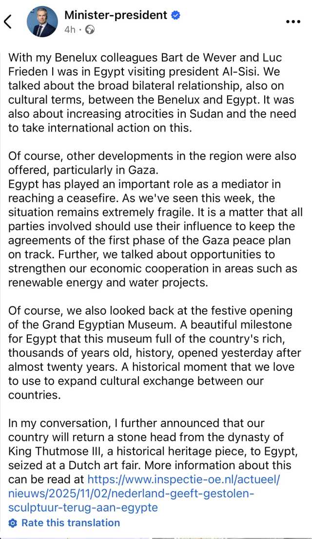وفي ختام منشوره، أعلن رئيس الوزراء أن بلاده ستُعيد إلى مصر قطعة أثرية فرعونية، هي رأس تمثال من أسرة الملك تحتمس الثالث، كانت قد صودرت في معرض فني بهولندا، مؤكدًا أن هذا القرار يأتي احترامًا للتراث المصري العريق وللتعاون الثقافي بين البلدين