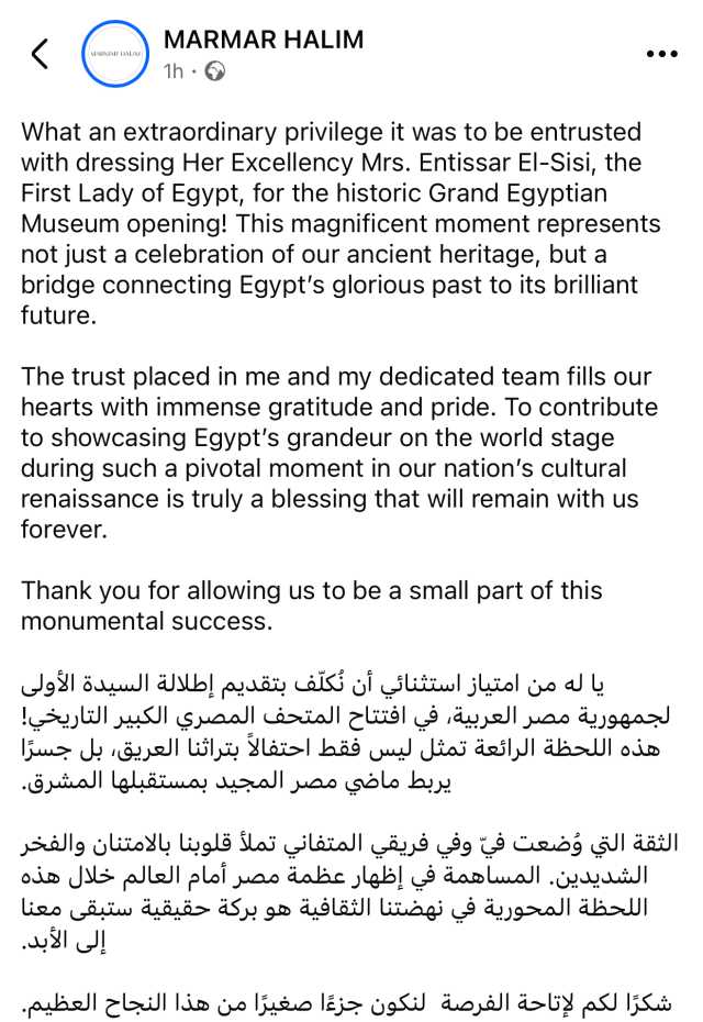 وقالت مرمر في اول تعليق لها عبر حسابها الشخصي بموقع فيسبوك: “يا له من امتياز استثنائي أن نُكلّف بتقديم إطلالة السيدة الأولى لجمهورية مصر العربية، في افتتاح المتحف المصري الكبير التاريخي! هذه اللحظة الرائعة تمثل ليس فقط احتفالاً بتراثنا العريق، بل جسرًا يربط ماضي مصر المجيد بمستقبلها المشرق.”