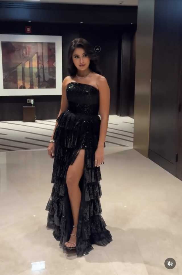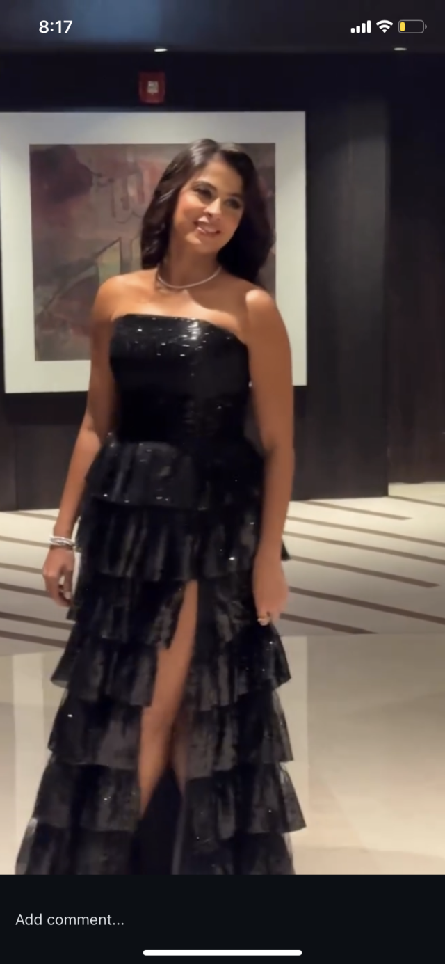 وظهرت روبي عبر حسابها على موقع التواصل الاجتماعي انستجرام بفستان لامع بلا أكمام وطويل بفتحة تصل لأعلى الفخذ ومن أسفل الوسط يتغير تصميم الفستان لطبقات قصيرة فوق بعضها .