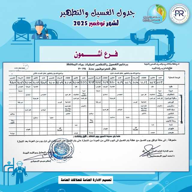 أعلن المهندس رشدي السيد عمر ، رئيس شركة مياه الشرب والصرف الصحى بالمنوفية، خطة غسيل شبكات المياه بكافة مناطق المحافظة خلال شهر نوفمبر 2025م وفقًا للمناطق المحددة بجدول الغسيل الدورى للشبكات .