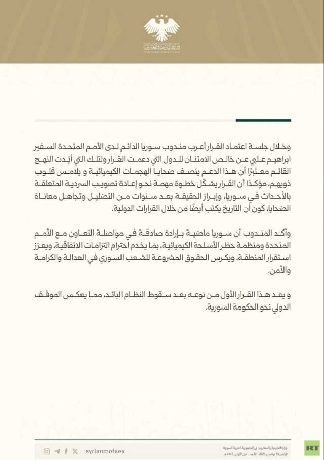 وأضافت الوزارة في البيان، أن القرار يرحب بجهود الحكومة السورية وتعاونها الكامل والشفاف مع منظمة حظر الأسلحة الكيميائية ويدعو لتقديم الدعم الدولي لها، كما يسلط الضوء على التزام سوريا بالعمل البناء في سياق الجهود الهادفة إلى تعزيز الشفافية وإعادة بناء الثقة.