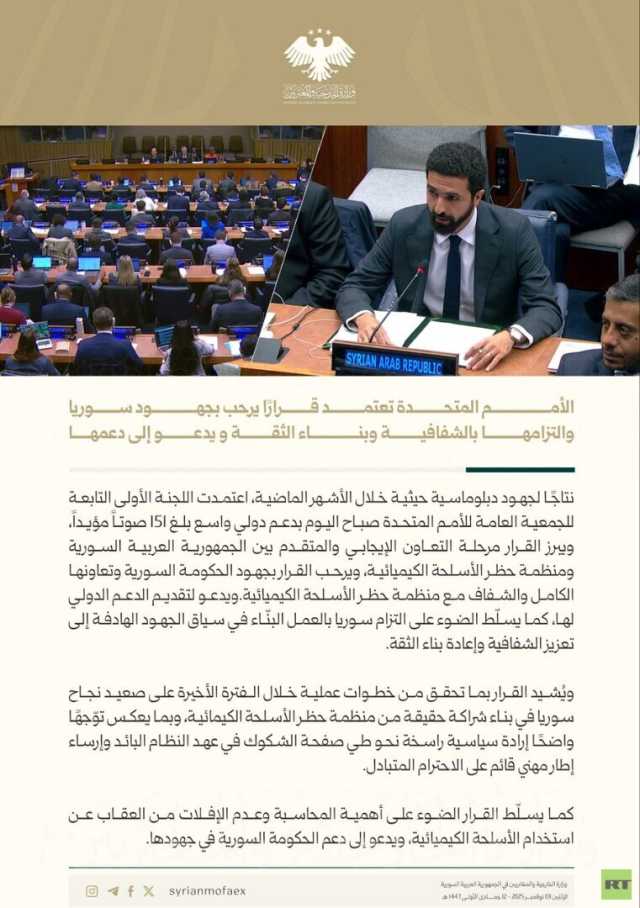 وبينت أن القرار يشيد بما تحقق من خطوات عملية خلال الفترة الأخيرة على صعيد نجاح سوريا في بناء شراكة حقيقة من منظمة حظر الأسلحة الكيمائية، وبما يعكس توجها واضحا وإرادة سياسية راسخة نحو طي صفحة الشكوك في عهد النظام السابق وإرساء إطار مهني قائم على الاحترام المتبادل.